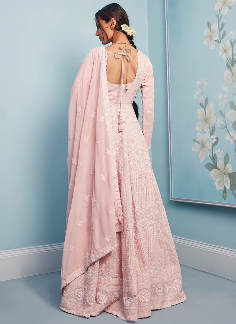 Our Blush Pink Thread Embroidered Anarkali is the embodiment of elegance and beauty, and perfect for this hot summer season. The pishwas features a beautiful blend of meticulously handcrafted thread and sequin embroideries against a pure georgette fabric. The set has been completed with a matching dupatta with subtly worked detailing and a thick chatta patti border stitched across all the four sides.