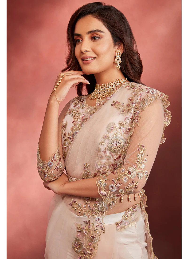 Light Pink and Peach Embroidered Pant Style Saree features a net blouse with santoon inner, silk pants and net saree drape. Zari, thread, sequins and and stone embellishments are used for the embroidery of this style.