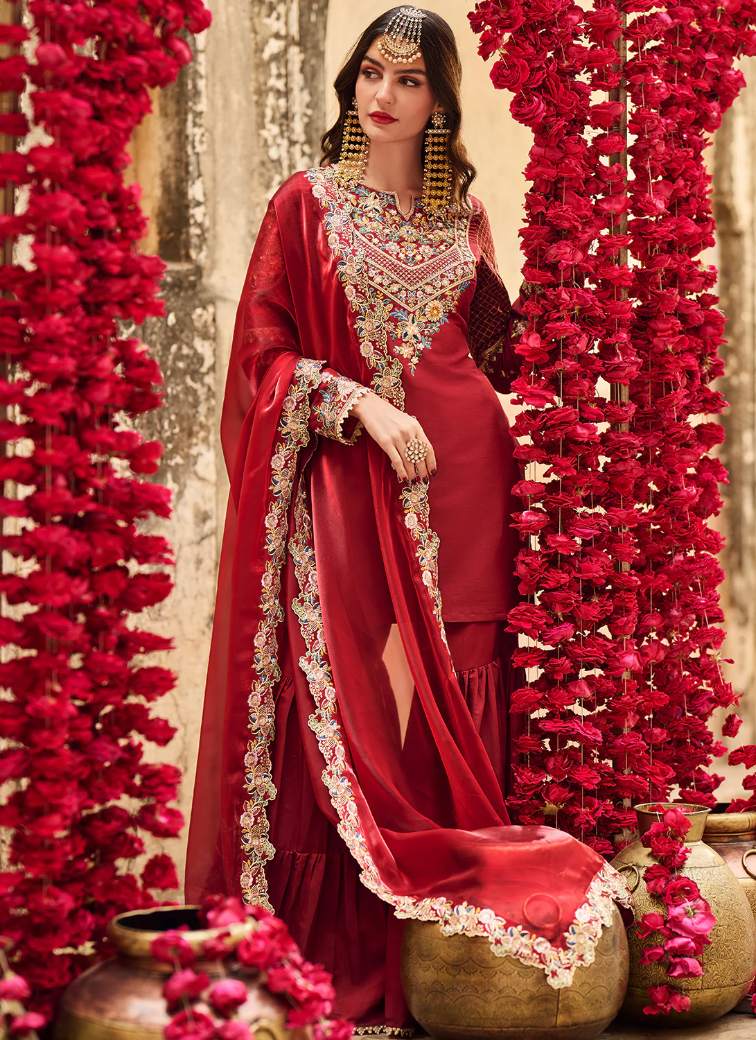 Maroon Embroidered Silk Gharara Suit