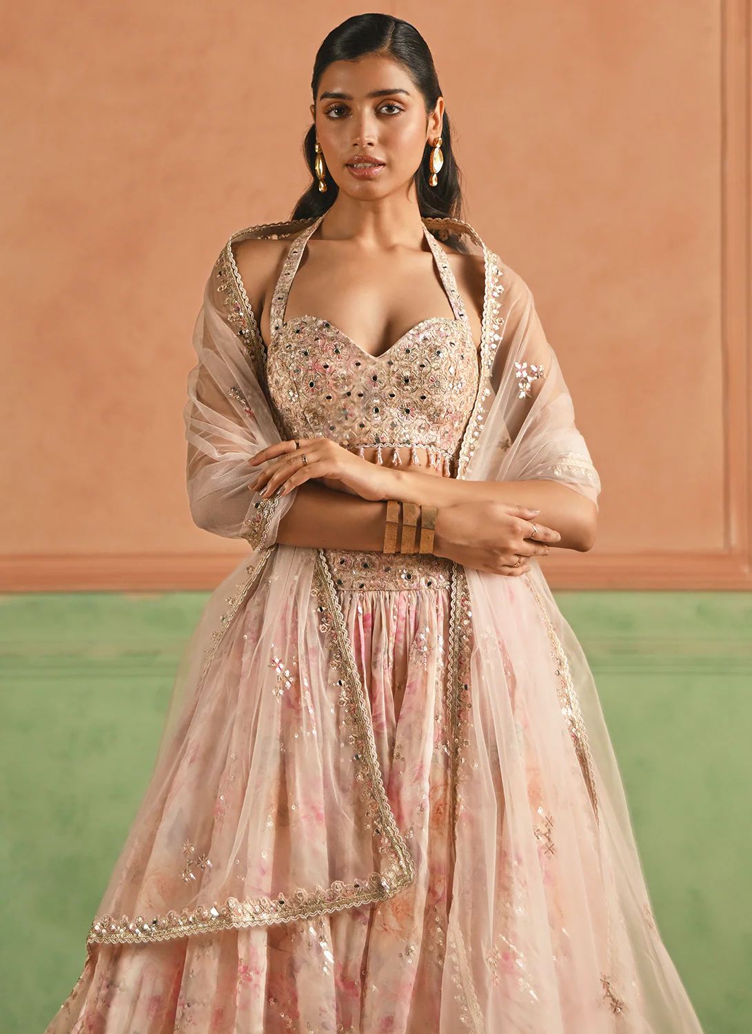 Our Pink Floral Embroidered Tissue Lehenga includes a tissue top with satin inner, tissue bottom with satin inner, and a net dupatta. Embroidery is present on this style using thread, sequins, and mirror work.