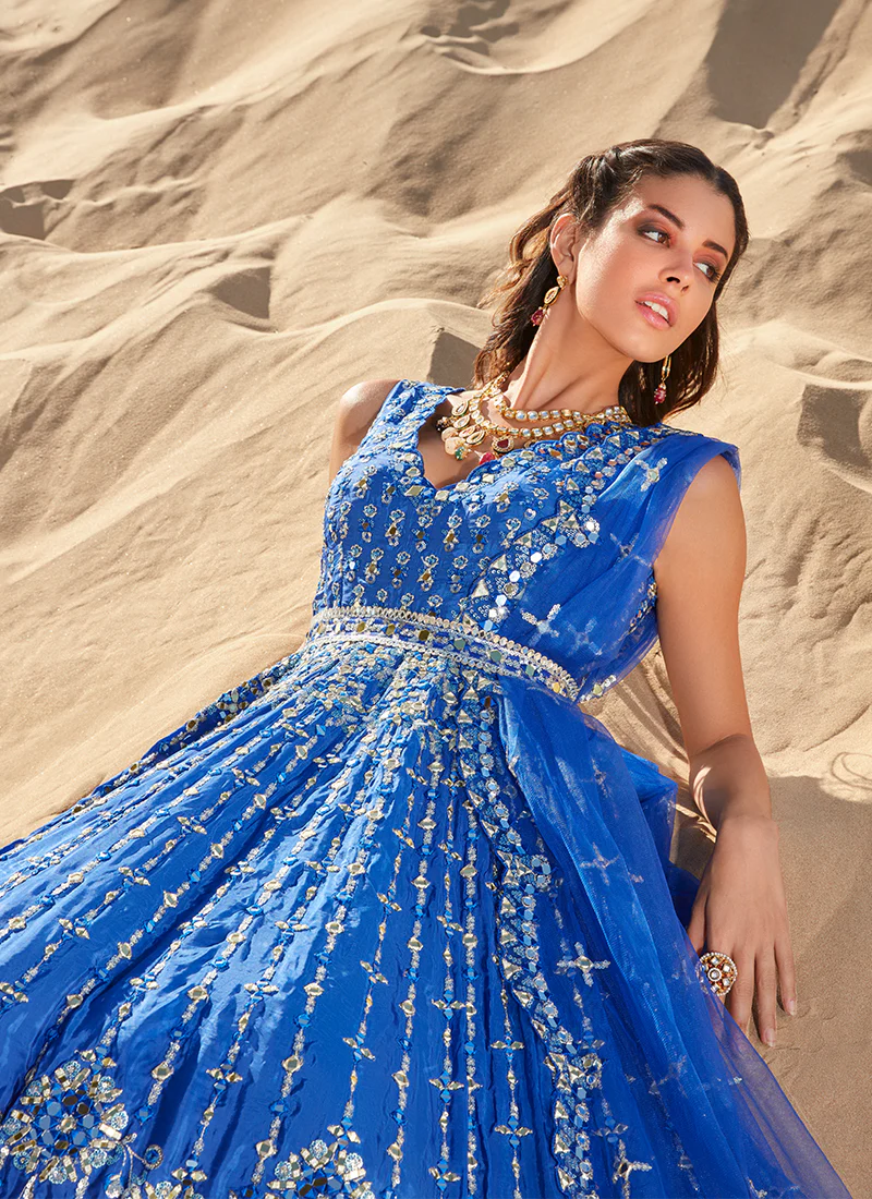 Another resplendent addition to our luxe 'Desert Princess' collection, our striking Royal Blue Mirror Embroidered Organza Anarkali embodies traditional craftsmanship with contemporary silhouettes. The bodice of the ensemble comprises a dainty spray of silver booties separated from the flare of the pishwas with an emblazoned belt. The kaliyan have been repleted with sleek taars of silver embellishments that fall into an abundant border of circular and floral handcrafted mirror work. The ensemble has been paired with a matching blue tulle dupatta with scalloped borders and eloborate sitara motifs.